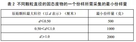 4.1.3 固體廢物為 GB 34330 所規定的喪失原有使用價值的物質時,每類物質作為一類固體廢物,分別采樣鑒別。采樣應滿足以下要求: a) 如危險特性全部來源于該物質本身,且在使用過程中危險特性不變或降低,應采集該物質未使用前的樣品。 b) 如危險特性全部或部分來源于使用過程,應在該物質不能繼續按照原有設計用途使用時采樣。 4.1.4 固體廢物為 GB 34330 所規定的生產過程(含固體廢物利用、處置過程)中產生的副產物,應根據產生工藝節點確定固體廢物類別,每類固體廢物分別采樣鑒別。采樣應滿足以下要求: a) 應在該固體廢物從正常生產工藝或利用工藝中分離出來的工藝環節采樣。 b) 應在生產設施、設備、原輔材料和生產負荷穩定的生產期采樣。 4.1.5 固體廢物為 GB 34330 所規定的環境治理和污染控制過程中產生的物質,應在污染控制設施污染物來源、設施運行負荷和效果穩定的生產期采樣;應根據環境治理和污染控制工藝流程,對不同工藝環節產生的固體廢物分別進行采樣。 4.1.6 堆存狀態的固體廢物,采樣應滿足以下要求: a) 如其產生過程尚未終止,應按 4.1.2~4.1.5 采集原產生工藝樣品。 b) 如其產生過程已經終止,則采集堆存的固體廢物。 c) 環境事件涉及的固體廢物,按本標準第 8 章相關要求采樣。 4.1.7 固體廢物為生產和服務設施更換或拆除的固定式容器、反應容器和管道,粉狀、半固態、液體產品使用后產生的包裝物或容器,以及產品維修或產品類廢物拆解過程產生的粉狀、半固態、液體物料的盛裝容器,采樣對象應為容器中的內容物,每類內容物作為一類固體廢物,分別采樣。 4.1.8 水體環境、污染地塊治理與修復過程產生的,需要按固體廢物進行處理處置的水體沉積物及污染土壤等環境介質,應盡可能在未發生二次擾動的情況下,根據水體、污染地塊污染物的擴散特征和環境調查結果,對不同污染程度的環境介質進行分類采樣。 4.1.9 需要開展危險廢物鑒別的建筑廢物,應盡可能在拆除、清理之前或過程中,根據建筑物的組成和污染特性進行分類,分別采樣。 4.2 份樣數的確定 4.2.1 危險廢物鑒別需根據待鑒別固體廢物的質量確定采樣份樣數(第 4.2.4 條所列情形除外),表 1為需要采集的固體廢物的最小份樣數。 4.2.2 堆存狀態的固體廢物,應以堆存的固體廢物總量為依據,按照表 1 確定需要采集的最小份樣數。 4.2.3 生產工藝過程中產生的固體廢物,以生產設施自試生產以來的實際最大生產負荷時的固體廢物產生量為依據,按照表 1 確定需要采集的最小份樣數。滿足第 4.1.2 條規定的固體廢物,以固體廢物產生量最大的單條生產線最大產生量為依據,按照表 1 確定需要采集的最小份樣數。固體廢物產生量根據以下方法確定: a) 連續產生固體廢物時,以確定的工藝環節一個月內的固體廢物產生量為依據,按照表 1 確定需要采集的最小份樣數。如果連續產生時段小于一個月,則以一個產生時段內的固體廢物產生量為依據。 b) 間歇產生固體廢物時,如固體廢物產生的時間間隔小于或等于一個月,應以確定的工藝環節一個月內的固體廢物最大產生量為依據,按照表 1 確定需要采集的最小份樣數。如固體廢物產生的時間間隔大于一個月,以每次產生的固體廢物總量為依據,按照表 1 確定需要采集的最小份樣數。 4.2.4 以下情形固體廢物的危險特性鑒別可以不根據固體廢物的產生量確定采樣份樣數: a) 鑒別樣品為本標準第 4.1.3 條 a)例所規定的物質,可適當減少采樣份樣數,份樣數不少于2 個。固體廢物為 4.1.7 條所規定的廢棄包裝物、容器時,內容物的采樣參照本條執行。 b) 固體廢物為廢水處理污泥,如廢水處理設施的廢水的來源、類別、排放量、污染物含量穩定,可適當減少采樣份樣數,份樣數不少于 5 個。 c) 固體廢物來源于連續生產工藝,且設施長期運行穩定、原輔材料類別和來源固定,可適當減少采樣份樣數,份樣數不少于 5 個。 d) 貯存于貯存池、不可移動大型容器、槽罐車內的液態廢物,可適當減少采樣份樣數。敞口貯存池和不可移動大型容器內液態廢物采樣份樣數不少于 5 個;封閉式貯存池、不可移動大型容器和槽罐車,如不具備在卸除廢物過程中采樣,采樣份樣數不少于 2 個。 e) 貯存于可移動的小型容器(容積≤1000L)中的固體廢物,當容器數量少于根據表 1 所確定的最小份樣數時,可適當減少采樣份樣數,每個容器采集 1 個固體廢物樣品。 f) 固體廢物非法轉移、傾倒、貯存、利用、處置等環境事件涉及固體廢物的危險特性鑒別,因環境事件處理或應急處置要求,可適當減少采樣份樣數,每類固體廢物的采樣份樣數不少于 5 個。 g) 水體環境、污染地塊治理與修復過程產生的,需要按照固體廢物進行處理處置的水體沉積物及污染土壤等環境介質,以及突發環境事件及其處理過程中產生的固體廢物,如鑒別過程已經根據污染特征進行分類,可適當減少采樣份樣數,每類固體廢物的采樣份樣數不少于 5 個。 4.3 份樣量的確定 4.3.1 固態廢物樣品采集的份樣量應同時滿足下列要求: a) 滿足分析操作的需要; b) 依據固態廢物的原始顆粒最大粒徑,不小于表 2 中規定的質量。 4.3.2 半固態和液態廢物樣品采集的份樣量應滿足分析操作的需要。 4.4 采樣的時間和頻次 4.4.1 連續產生。樣品應分次在一個月(或一個產生時段)內等時間間隔采集;每次采樣在設備穩定運行的 8 小時(